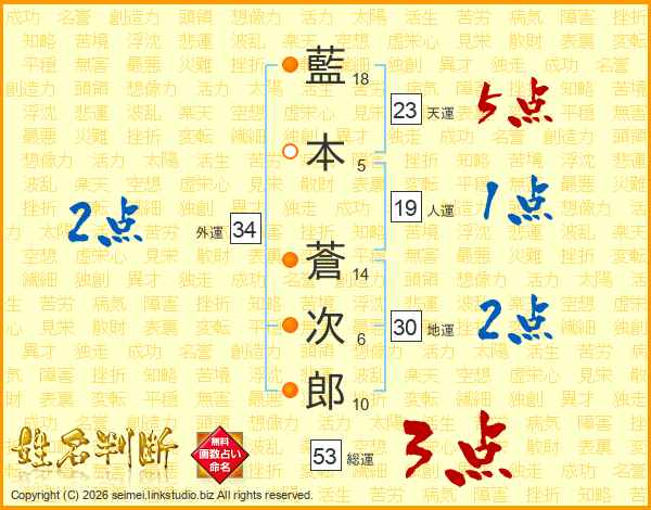 藍(18画)本(5画) 蒼(14画)次(6画)郎(10画)
