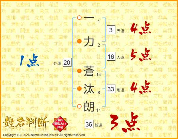 一(1画)力(2画) 蒼(14画)汰(8画)朗(11画)
