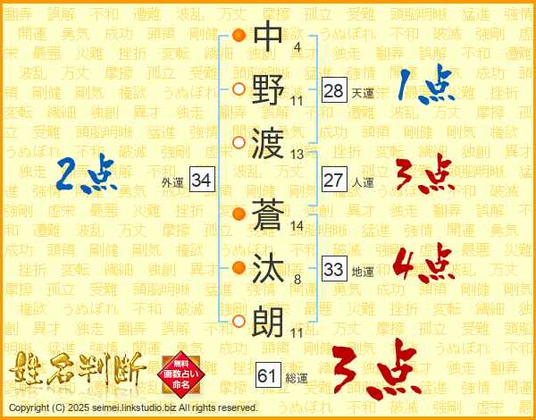 中(4画)野(11画)渡(13画) 蒼(14画)汰(8画)朗(11画)