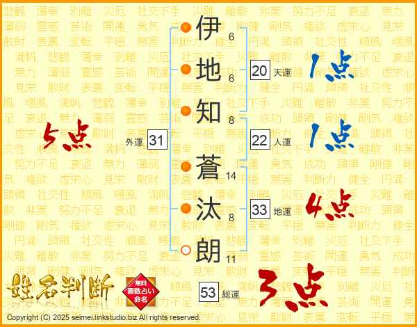 伊(6画)地(6画)知(8画) 蒼(14画)汰(8画)朗(11画)