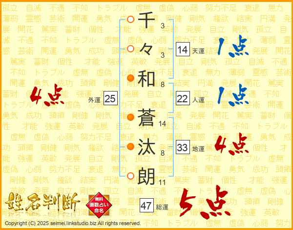 千(3画)々(3画)和(8画) 蒼(14画)汰(8画)朗(11画)