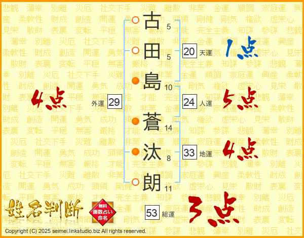 古(5画)田(5画)島(10画) 蒼(14画)汰(8画)朗(11画)