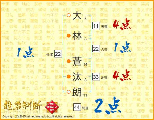 大(3画)林(8画) 蒼(14画)汰(8画)朗(11画)