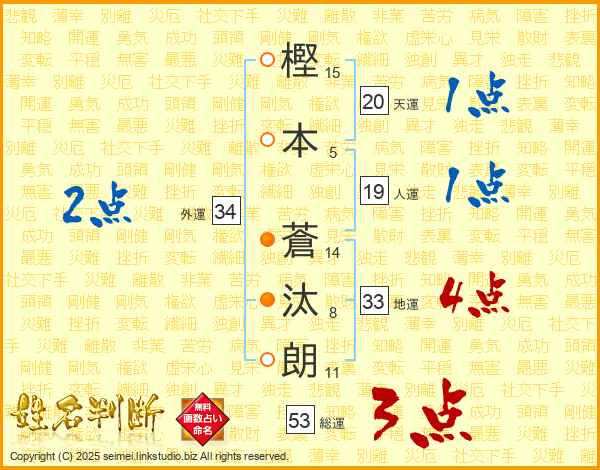 樫(15画)本(5画) 蒼(14画)汰(8画)朗(11画)