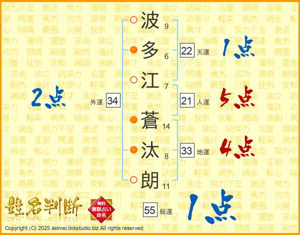 波(9画)多(6画)江(7画) 蒼(14画)汰(8画)朗(11画)