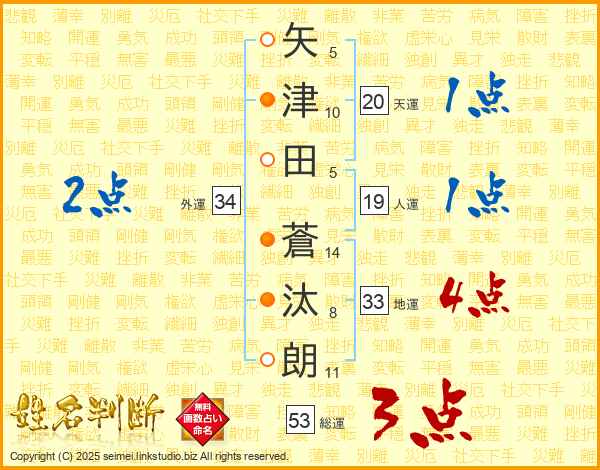 矢(5画)津(10画)田(5画) 蒼(14画)汰(8画)朗(11画)