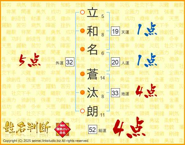 立(5画)和(8画)名(6画) 蒼(14画)汰(8画)朗(11画)