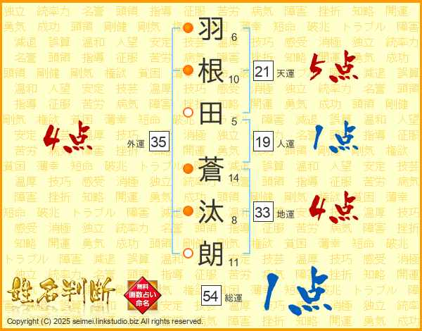 羽(6画)根(10画)田(5画) 蒼(14画)汰(8画)朗(11画)