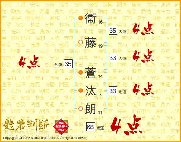 衞(16画)藤(19画) 蒼(14画)汰(8画)朗(11画)