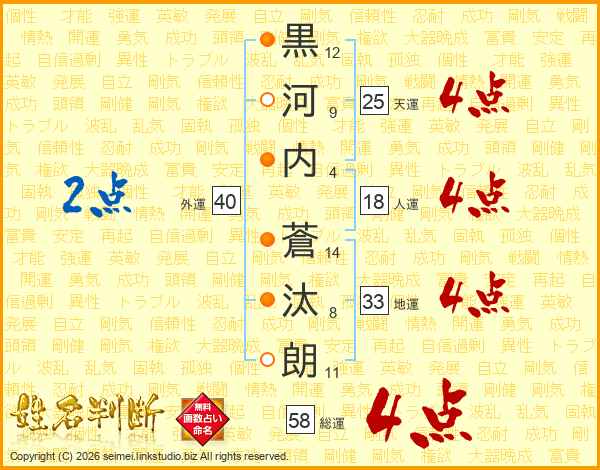 黒(12画)河(9画)内(4画) 蒼(14画)汰(8画)朗(11画)