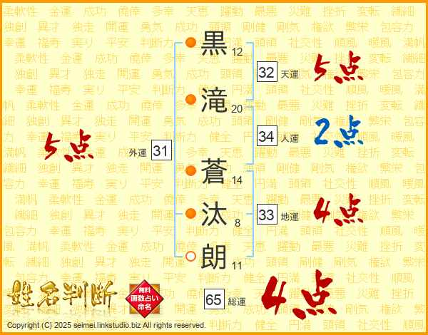黒(12画)滝(20画) 蒼(14画)汰(8画)朗(11画)
