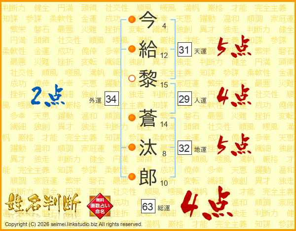 今(4画)給(12画)黎(15画) 蒼(14画)汰(8画)郎(10画)