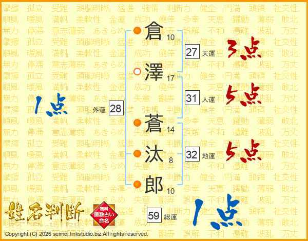 倉(10画)澤(17画) 蒼(14画)汰(8画)郎(10画)