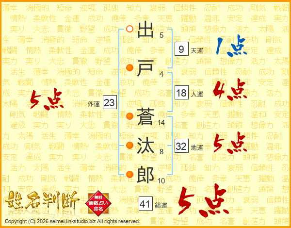 出(5画)戸(4画) 蒼(14画)汰(8画)郎(10画)