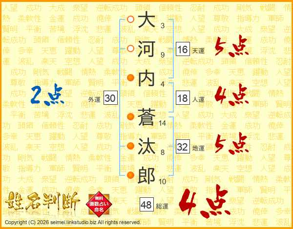 大(3画)河(9画)内(4画) 蒼(14画)汰(8画)郎(10画)