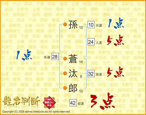 孫(10画) 蒼(14画)汰(8画)郎(10画)