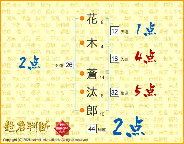 花(8画)木(4画) 蒼(14画)汰(8画)郎(10画)
