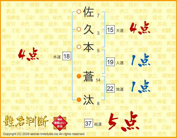 佐(7画)久(3画)本(5画) 蒼(14画)汰(8画)