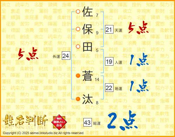佐保田蒼汰さんの天運は21画の5点!