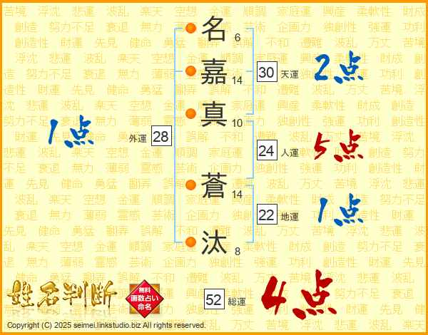 名(6画)嘉(14画)真(10画) 蒼(14画)汰(8画)