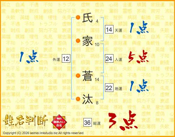 氏(4画)家(10画) 蒼(14画)汰(8画)