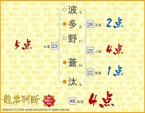 波(9画)多(6画)野(11画) 蒼(14画)汰(8画)