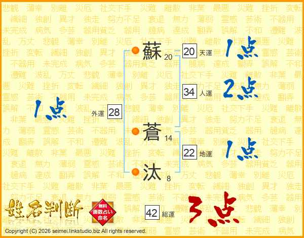 生活面を象徴する運勢です。外部から受ける影響力を表し、結婚運、家庭運や職場、環境への順応性を表します。総運から人運を引いた画数。姓や名が1文字の場合を除く。