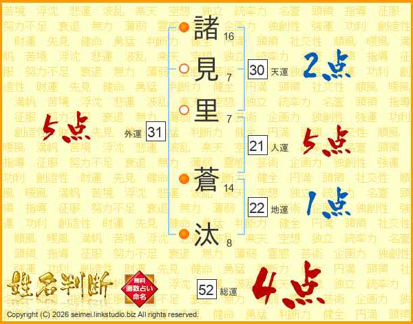 諸(16画)見(7画)里(7画) 蒼(14画)汰(8画)