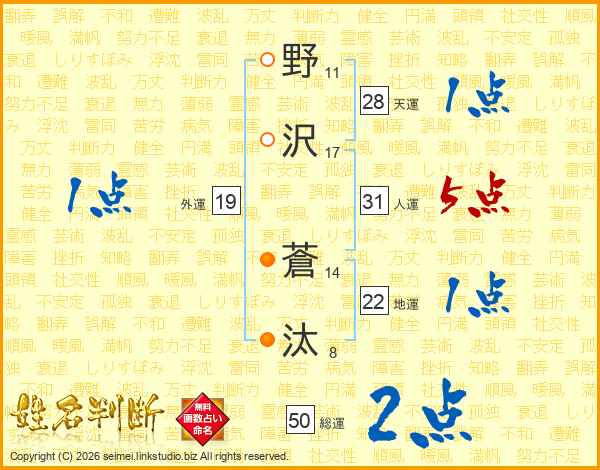 野(11画)沢(17画) 蒼(14画)汰(8画)