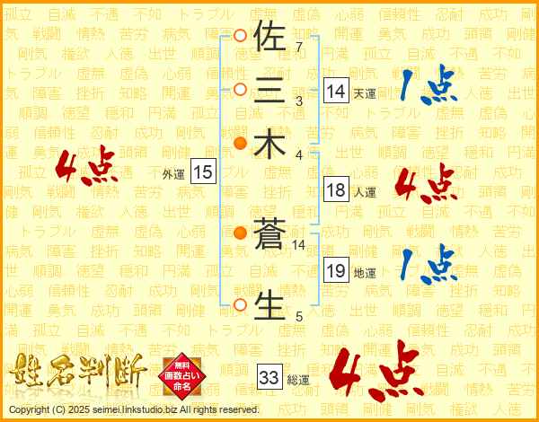 佐(7画)三(3画)木(4画) 蒼(14画)生(5画)