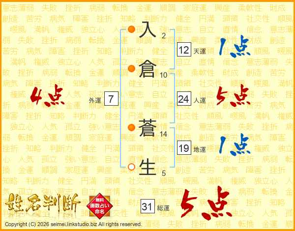 入(2画)倉(10画) 蒼(14画)生(5画)