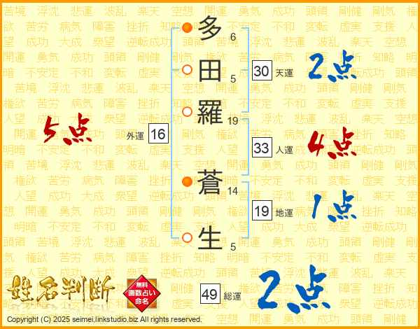 多(6画)田(5画)羅(19画) 蒼(14画)生(5画)