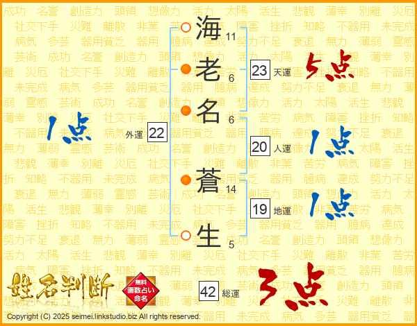 海(11画)老(6画)名(6画) 蒼(14画)生(5画)