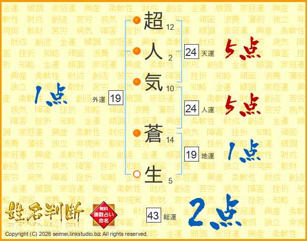 超(12画)人(2画)気(10画) 蒼(14画)生(5画)