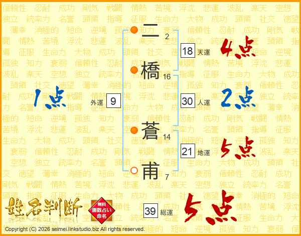 二(2画)橋(16画) 蒼(14画)甫(7画)