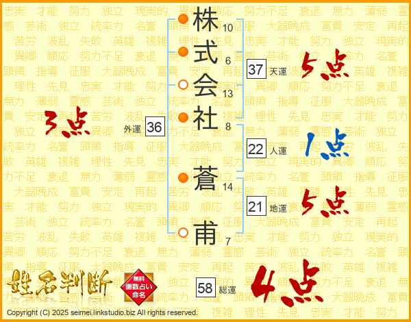 株(10画)式(6画)会(13画)社(8画) 蒼(14画)甫(7画)