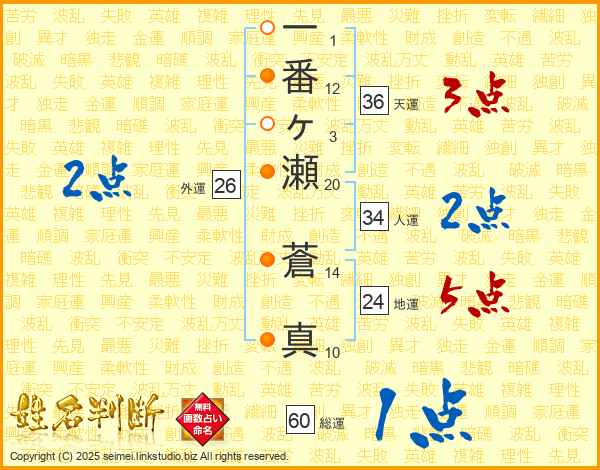 一番ヶ瀬蒼真さんの総運は60画の1点!