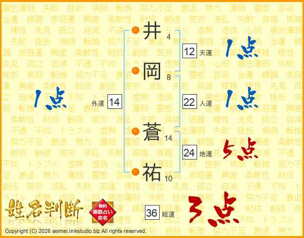 井(4画)岡(8画) 蒼(14画)祐(10画)