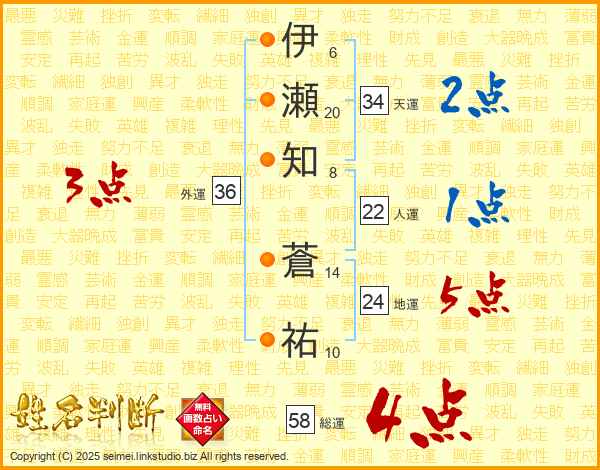 伊(6画)瀬(20画)知(8画) 蒼(14画)祐(10画)