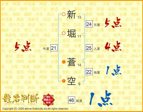 新堀蒼空さんの総運は46画の1点!
