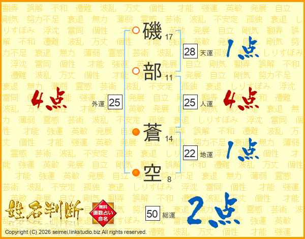 生活面を象徴する運勢です。外部から受ける影響力を表し、結婚運、家庭運や職場、環境への順応性を表します。総運から人運を引いた画数。姓や名が1文字の場合を除く。