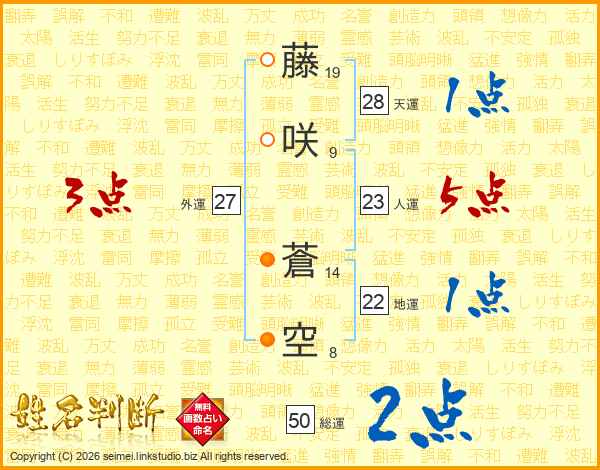 藤(19画)咲(9画) 蒼(14画)空(8画)