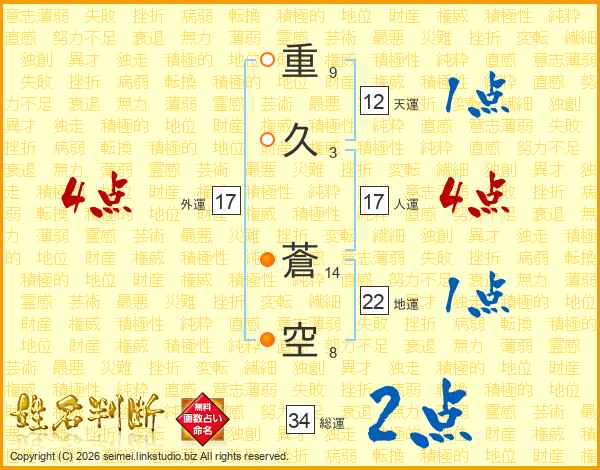 重久蒼空さんの総運は34画の2点!