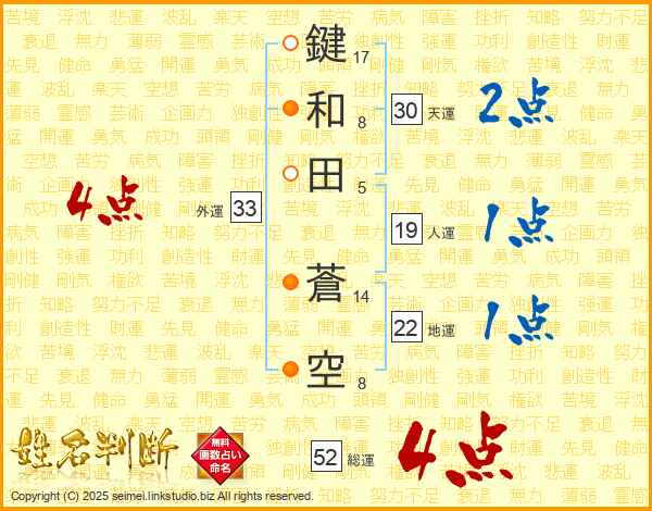 生活面を象徴する運勢です。外部から受ける影響力を表し、結婚運、家庭運や職場、環境への順応性を表します。総運から人運を引いた画数。姓や名が1文字の場合を除く。