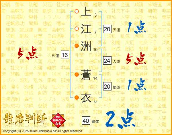 生活面を象徴する運勢です。外部から受ける影響力を表し、結婚運、家庭運や職場、環境への順応性を表します。総運から人運を引いた画数。姓や名が1文字の場合を除く。