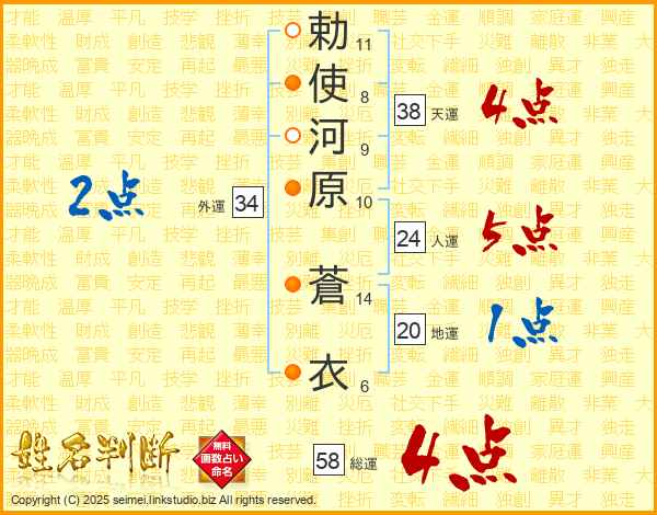 勅(11画)使(8画)河(9画)原(10画) 蒼(14画)衣(6画)