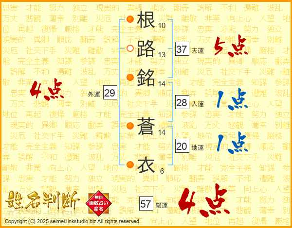 根(10画)路(13画)銘(14画) 蒼(14画)衣(6画)
