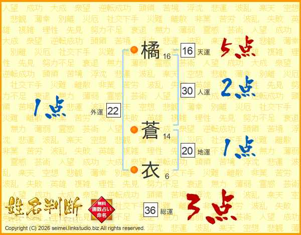 あなたの人生を表す1番重要な運勢です。生涯を通じて影響する総合運となり、主に50歳以降の晩年期に影響を及ぼします。苗字と名前の合計画数。