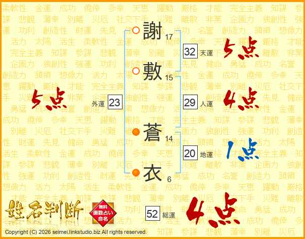 謝敷蒼衣さんの総運は52画の4点!