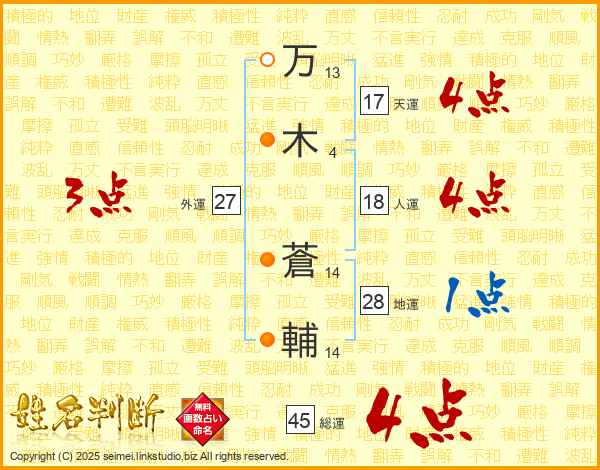 万(13画)木(4画) 蒼(14画)輔(14画)